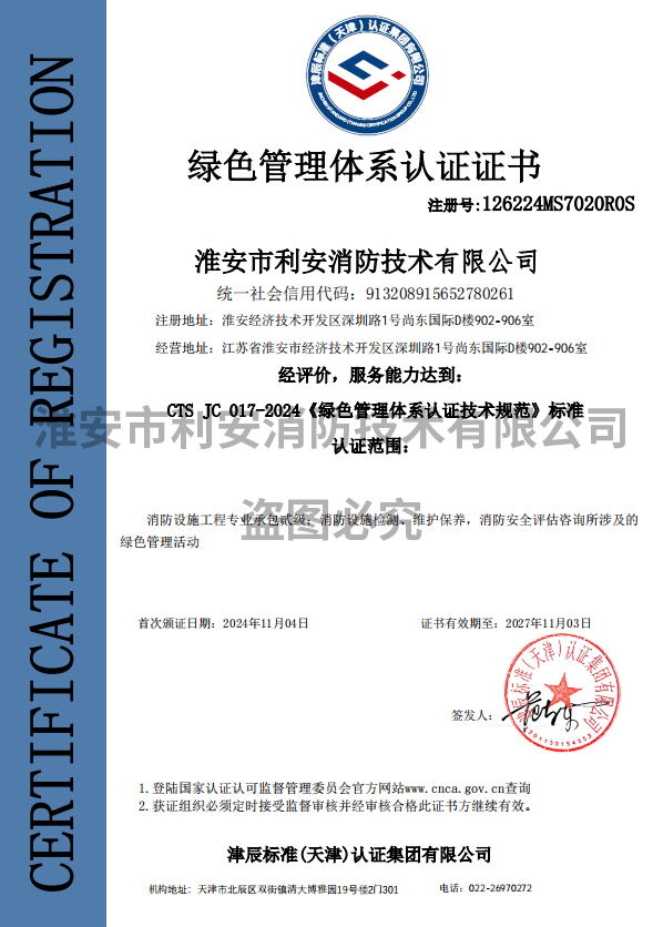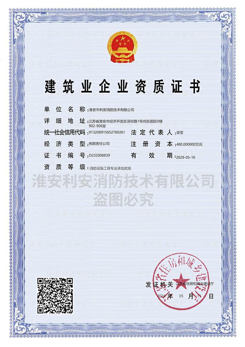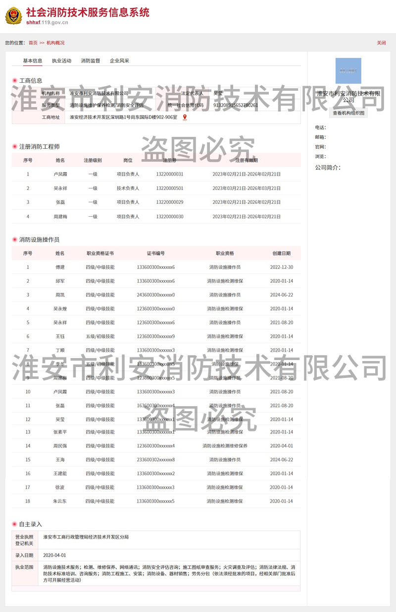 淮安市利安消防技术有限公司成立于二0一0年,目前满足2019年8月29日,应急管理部颁布《消防技术服务机构从业条件》,已在江苏消防网注册备案,可以从事消防设施的检测、维修保养、消防评估,且取得江苏省建委颁发的消防设施工程专业承包贰级资质证书,可从事消防设施安装。